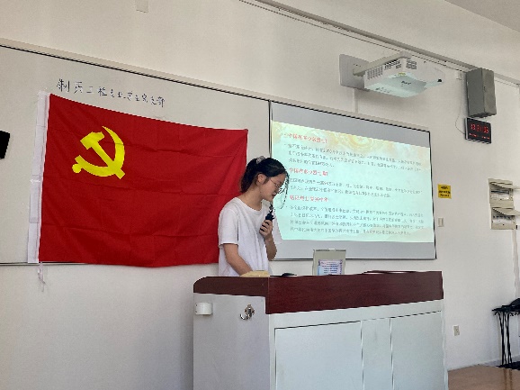 最后,学生党员倪懿凤同志将新生入党启蒙和 “烈士纪念日”、国庆日党史学习教育相结合,通过漫画和视频的形式向大家再现了1949年建国和1950年开始的抗美援朝战争,通过学习历史,缅怀先烈,鼓励新时代的青年适应时代发展的要求,正确认识祖国的历史和现实,增强爱国的情感和振兴祖国的责任感,树立民族自尊心与自信心,弘扬伟大的中华民族精神,高举爱国旗帜,锐意进取,自强不息,艰苦奋斗,顽强拼搏,真正把爱国之志变成报国之行。