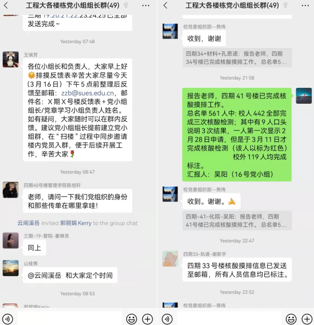 鼓励学生党员参与抗疫志愿服务。研究生党支部在园区成立党员抗疫志愿先锋队,按照学校疫情防控工作相关要求,承担了传递疫情防控信息、协助组织核酸检测、代购日常生活用品、分发一日三餐食品和代取快递代收垃圾等工作,发挥了党员先锋模范作用及党支部的战斗堡垒作用。在“足不出户”的抗疫倡议下,本科生党支部在楼栋成立了临时党小组,学生党员积极行动,配合学校开展数据统计、核酸检测等相关工作,助力疫情防控。
