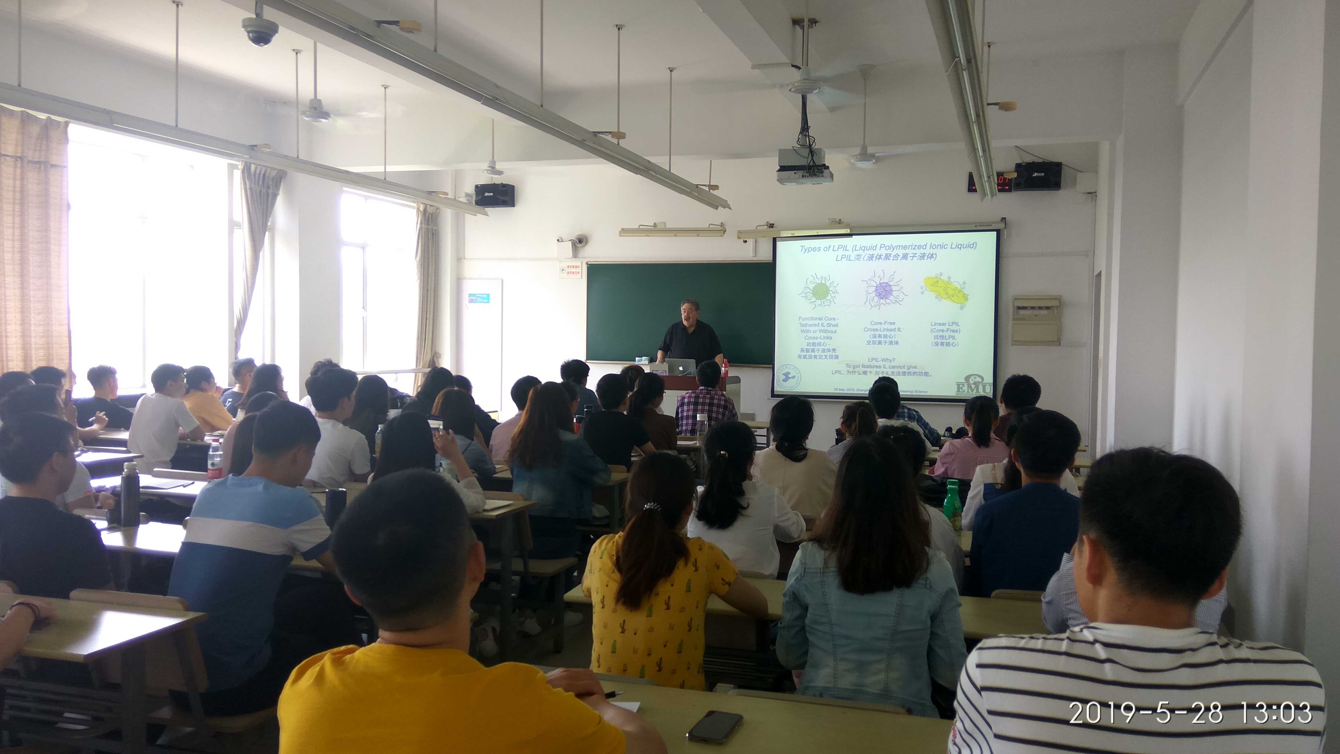 5月28日下午,世界著名涂料专家,美国东密歇根大学杰出教授John Texter应邀来校,在教学楼C411给金沙威尼斯欢乐娱人城研究生和本科生作了《Liquid Polymerized Ionic Liquids for Advanced Materials and Coatings》的专题讲座,讲座由高分子材料与工程系主任王继虎主持。