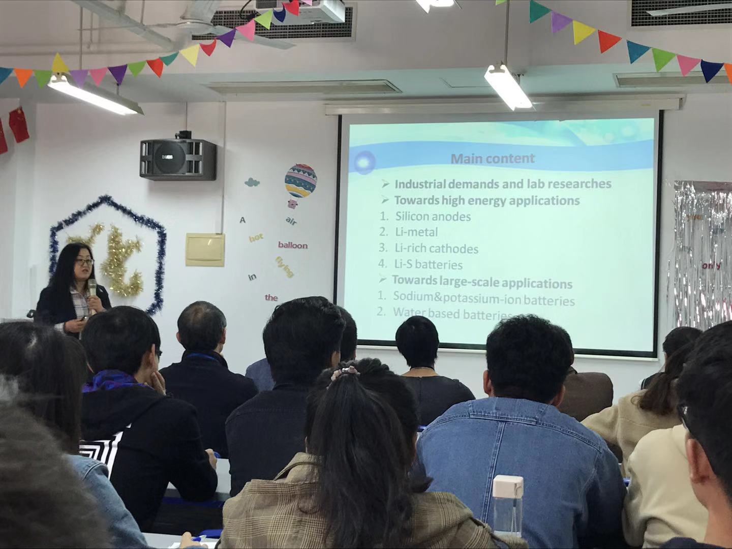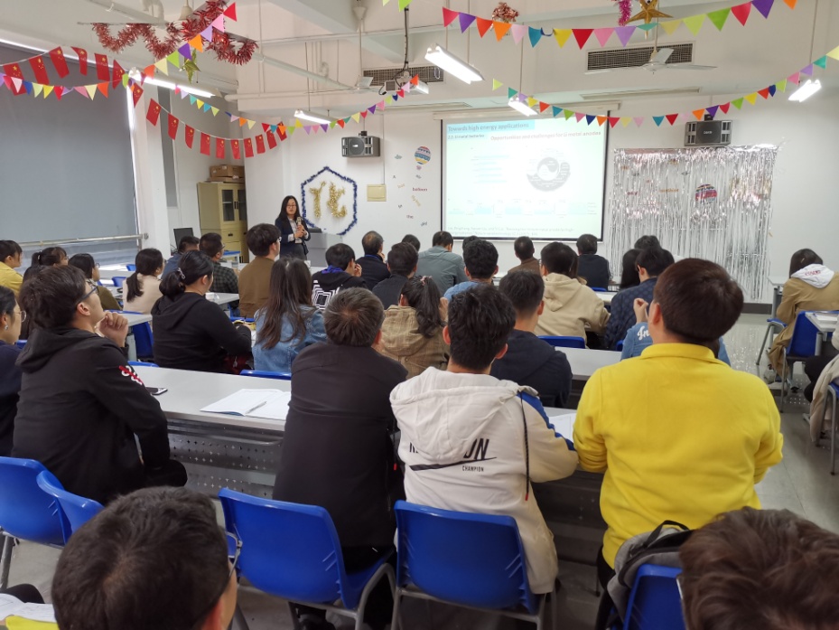 郭教授首先介绍了储能设备的重要性及发展现状,并强调了学术工作者要直面和解决工业界真正的需求和做有用的研究。随后,郭教授介绍了其课题组近期在开发高能量密度电池(锂离子、锂金属、锂硫)和低成本、大规模储能电池(钠离子、钾离子、水系锌离子)的一些研究成果。通过实验数据和图片,郭教授详细讲解了一些代表性电极材料,如硅负极、锂金属、硫、氧化物正极、钠/钾负极材料、锌负极等的设计、制备、组装、结构和性能关系等问题,并提出了改善材料的倍率性能、循环性能与表界面稳定性不足等关键问题的解决对策。郭教授在电极材料的性能提升和深入的机理探讨等方面做出了大量、杰出的工作,报告内容丰富、深入浅出,与会师生深受启发,开阔了眼界。报告会后,郭教授和与会师生进行了积极、深入的互动交流,师生们受益匪浅,反响热烈。