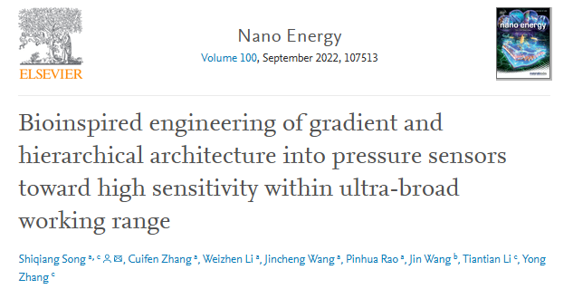 Recently, Song Shiqiang, associate professor of the School of Chemistry and Chemical Engineering of our university, has made important research achievements in the field of flexible wearable devices, and the related research was published in the international top journal Nano Energy (impact factor 19.069, top journal of the basic/upgraded version of the Chinese Academy of Sciences) under the title of Bioinspired Engineering of Gradient and Hierarchical Architecture into Pressure Sensors toward High Sensitivity within Ultra road Working Range, It was highly praised by the reviewers.