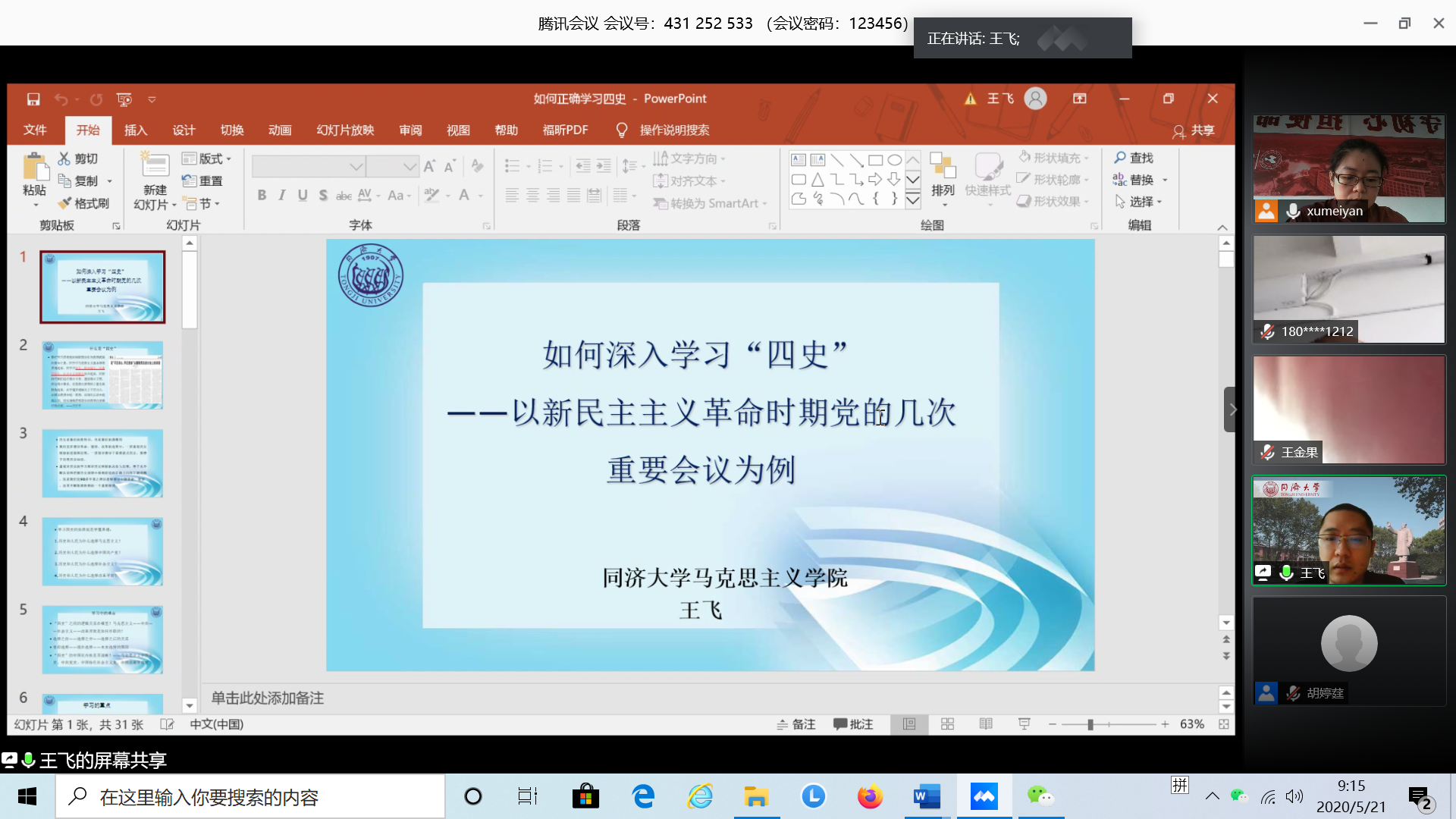 金沙威尼斯欢乐娱人城党委特邀中宣部马工程重点项目参与者,中宣部理论通俗读物编写人员,中央马工程教材辅导用书编写人员,全国马克思主义学科发展报告历史虚无主义分编撰写者,同济大学马克思主义学院王飞老师作了题为《如何深入学习“四史”》的专题报告。王老师以新民主主义革命时期党的几次重要会议,包括中共一大和二大、八七会议、遵义会议、六届六中全会和中共七大等为例,讲解了“四史”学习的重点、难点和学习方法,为党员们更有效地学习四史提供了一个新的学习角度和思考路径。同时,王老师在报告中,梳理分析了这几次会议对中国共产党发展历程的深刻影响,并对共产党人在革命过程中的革命热情、艰苦奋斗、与时俱进、勇于担当、自我革新的革命精神进行了深入解读,进一步加深了党员们对党的历史和优良传统的理解和铭记。