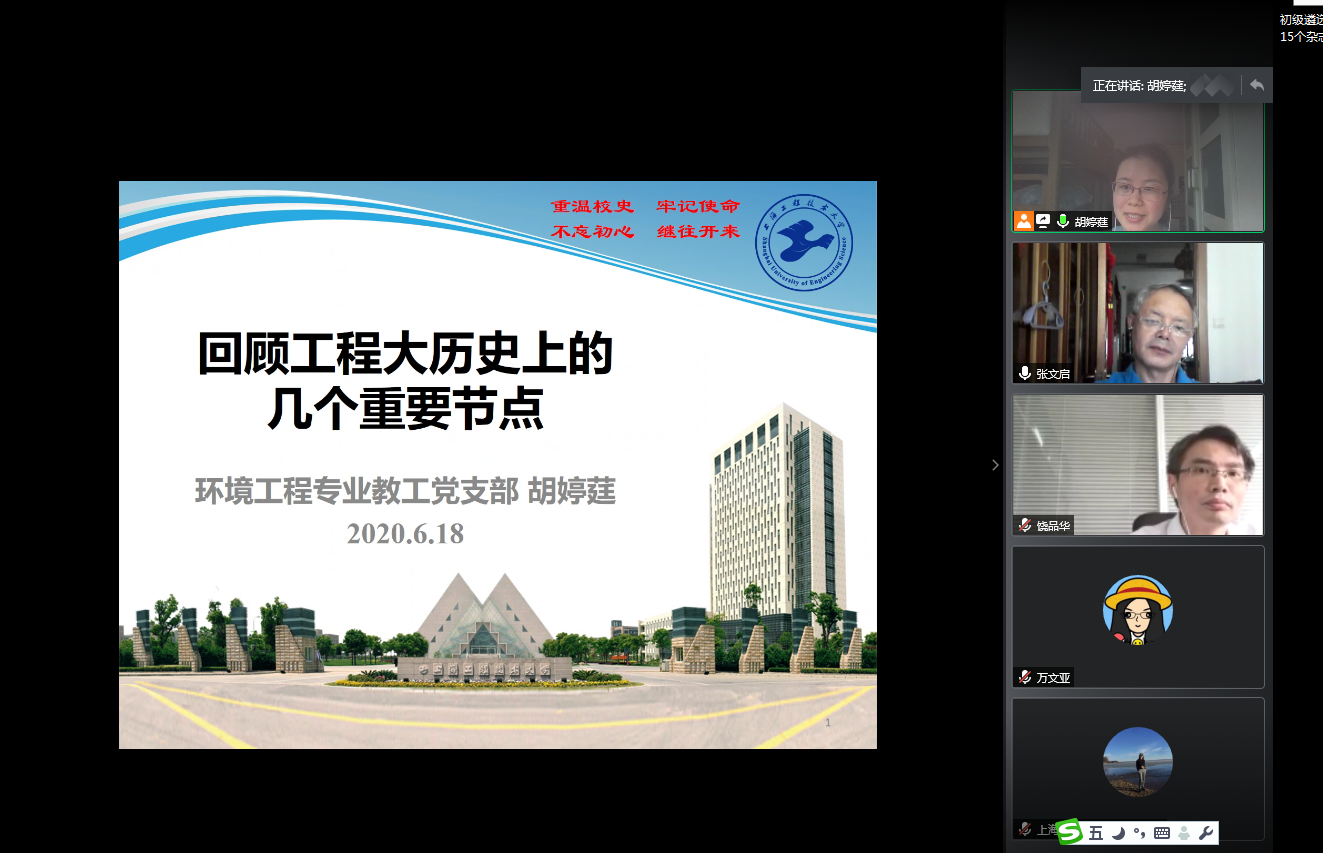 金沙威尼斯欢乐娱人城环境工程专业教工党支部于2020年6月18日上午10:30通过腾讯会议平台开展了 “四史”学习专题党课——“工程大历史的几个重要节点及其思考”。会议由支部书记胡婷莛同志主持,支部全体党员同志和部分观摩团教师党员参加。