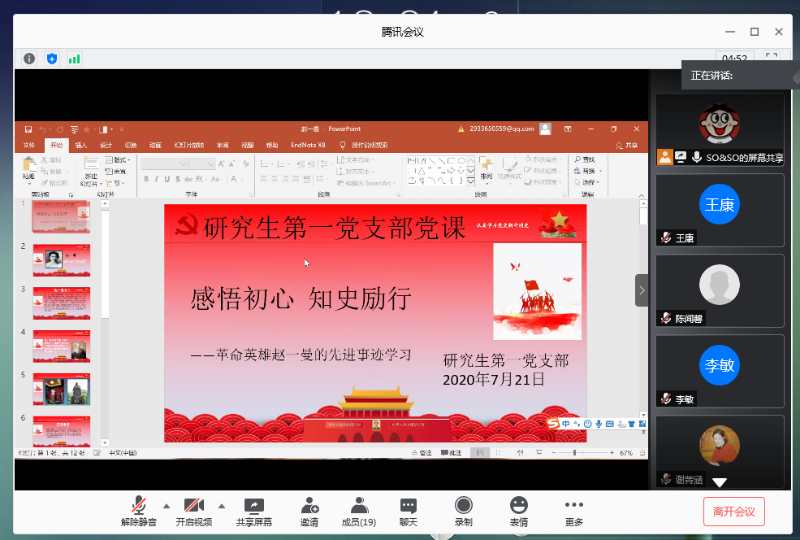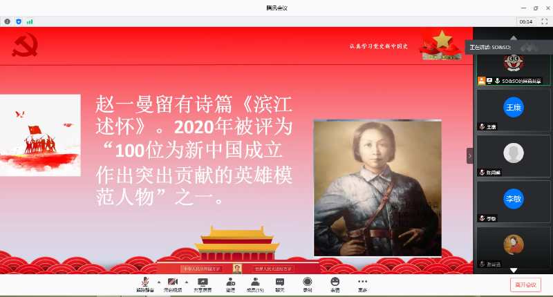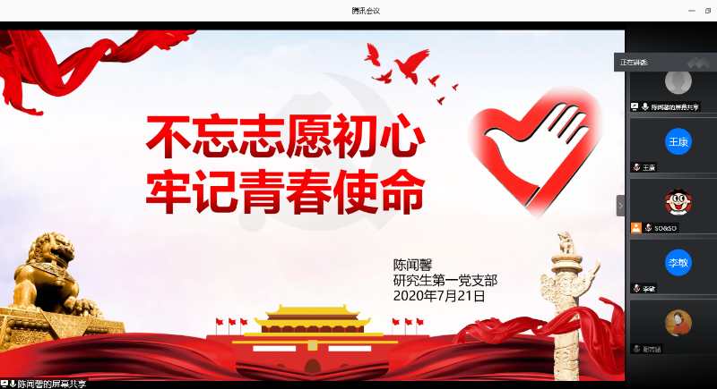 金沙威尼斯欢乐娱人城研究生第一党支部于7月21日下午通过腾讯会议平台开展了“四史”学习教育特色微党课——“感悟初心,知史励行”和先锋党课——“不忘志愿初心,牢记青春使命”。会议由支部书记李晓春主持,全体支部党员参加,王金果副院长观摩了本次党课学习。